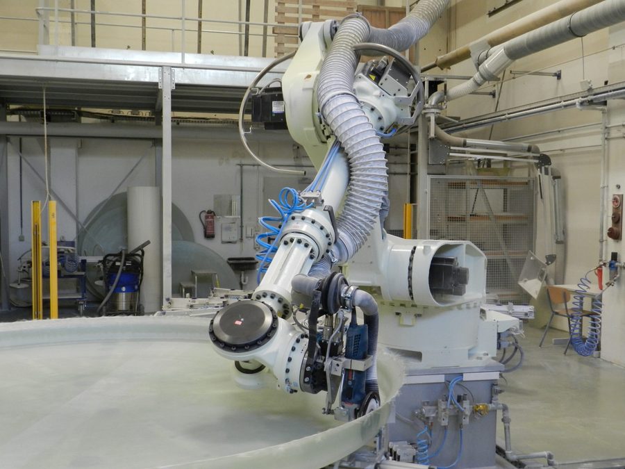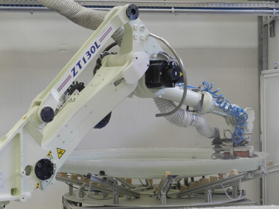 Due to the robot’s success, Haase added a Kawasaki BX100L robot to the production site to apply resin and glass fibers to a mold. They also added another ZT130L for working lids and bottoms with the automatic tool change system. This system provides them the flexibility they need to manufacture approximately 100 different tank types as needed.