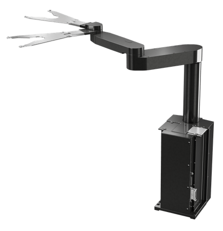 The long arm that is offset from the center of the base can access 4FOUP without a track.