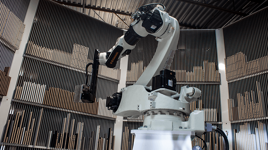 As part of Kawasaki’s general-purpose, high-payload range, the ZX130L is a workhorse with a wide work envelope (130 kg payload) and a long reach of up to 2,951 mm. Mounted to a robot transfer unit (RTU), the ZX130L gains a 7th axis, enabling optimal space utilization, operations, and reach. This configuration allows the robot to pick each panel from a nest position and process it accordingly, thanks to the custom vision-guided end-of-arm tool (EOAT).