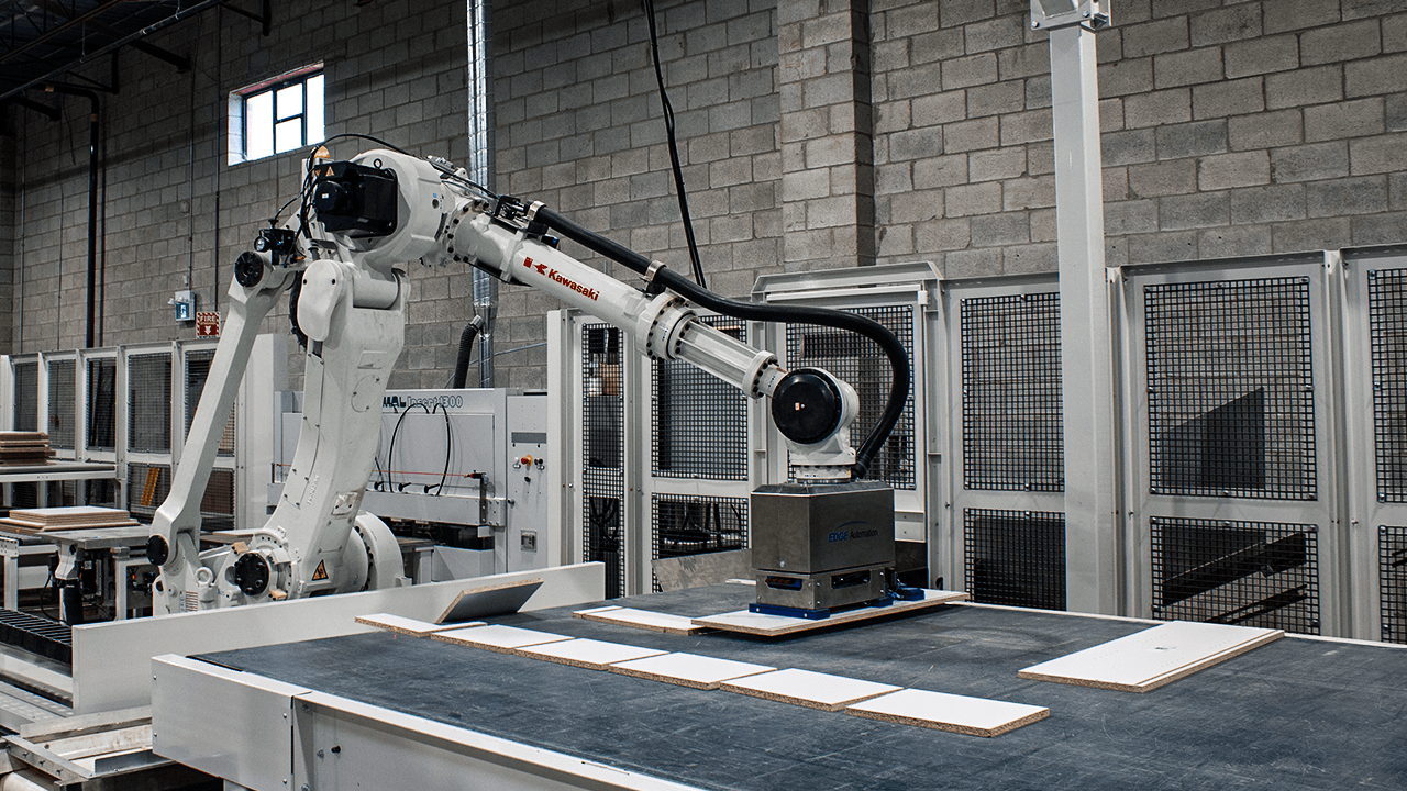 To address Fabbrica Unique’s complex needs, Edge Automation proposed the CabSort™ MAX system—a modular, intelligent material-handling robotic cell featuring a Kawasaki ZX130L flexible, heavy-duty robot. The Robotic Nest Unloading solution sits directly at the outfeed conveyor of the nesting CNC machine, where it actively streamlines post-processing operations. As soon as the CNC machine finishes its cutting cycle, it automatically labels each part—ensuring traceability and keeping everything aligned with downstream processes.
