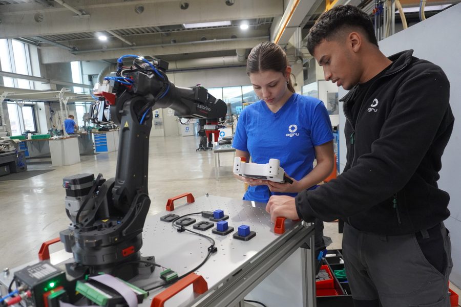 Kawasaki Roboter haben inzwischen auch in der Ausbildung Einzug gehalten: Seit 2015 hat der Ausbildungsbetrieb AGRU auf 860 m2 eine eigene Lehrwerkstätte, in der Auszubildende praxisnah arbeiten – jedes Jahr werden aus vielen Bewerbungen zehn neue Auszubildende ausgesucht. Im September 2025 kam der Kawasaki Trainingsroboter Astorino erstmalig dazu. Der speziell für Lehre konzipierte Roboter besteht aus 3D-gedruckten Komponenten und ermöglicht es, Roboterprogrammierung intuitiv und authentisch zu lernen. Für das Team der Lehrwerkstätte sind die Ziele klar: „Wie kürzen wir Anlernphasen ab und steigern gleichzeitig die Lernkurve? Und wie lösen wir Berührungsängste für Auszubildende und Mitarbeiter? Astorino erfüllt genau diese Ziele und begeistert die Auszubildenden“, so Herr Michael Binder, Leiter der Lehrwerkstätte.