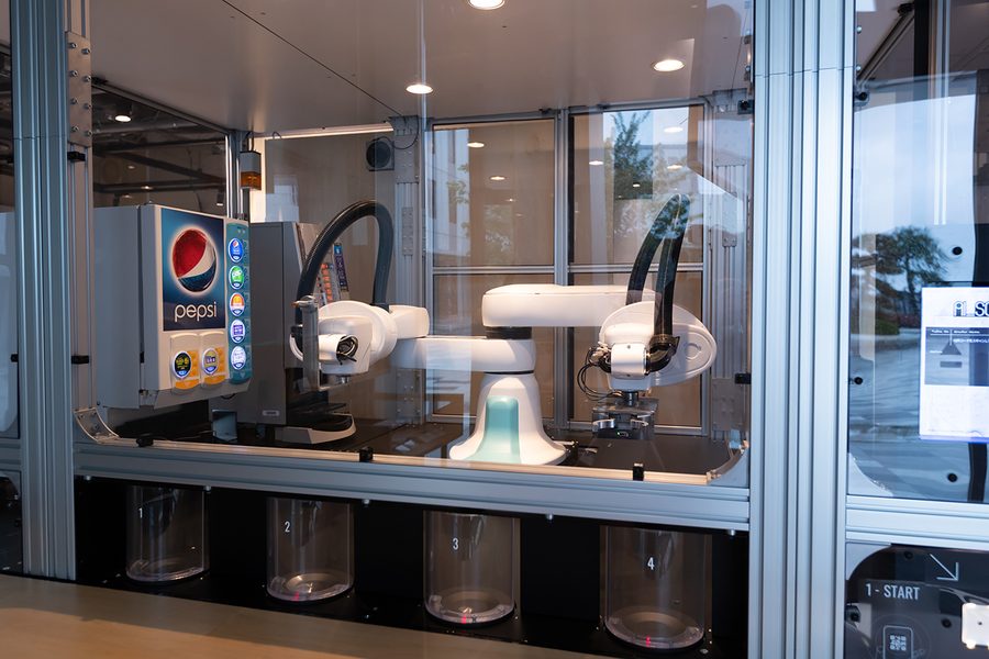 ドリンクコーナー担当は、人共存型双腕スカラロボット「duAro2」。自動飲料機にカップをセッティングしてメニューボタンを押し、ドリンクをお客様に提供します。