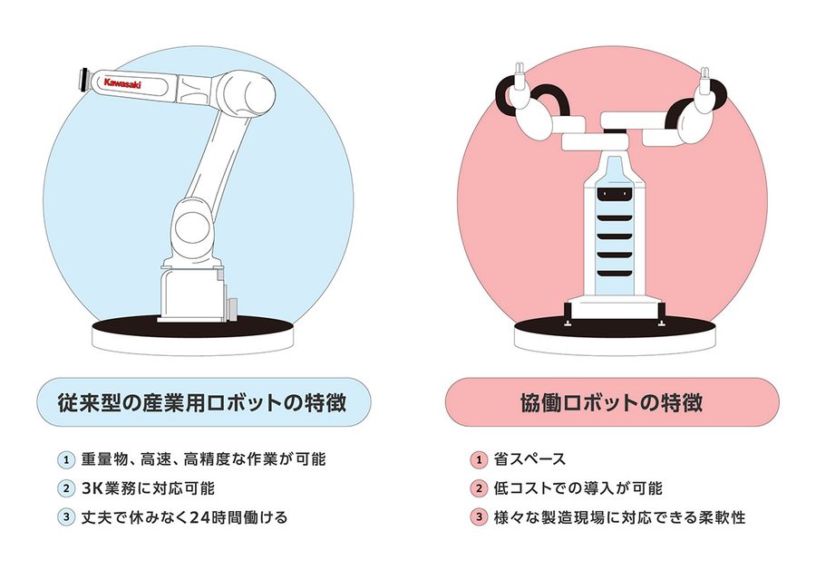 協働ロボットには、①柵などの安全設備を必要としないので、生産現場の省スペース化を図れる ②そのため、専用設備が少なくなり、初期投資を抑えることができる ③将来生産工程を変更するときも専用設備が少ないので簡単に対応できるなど、従来の産業用ロボットにはないメリットがあります。