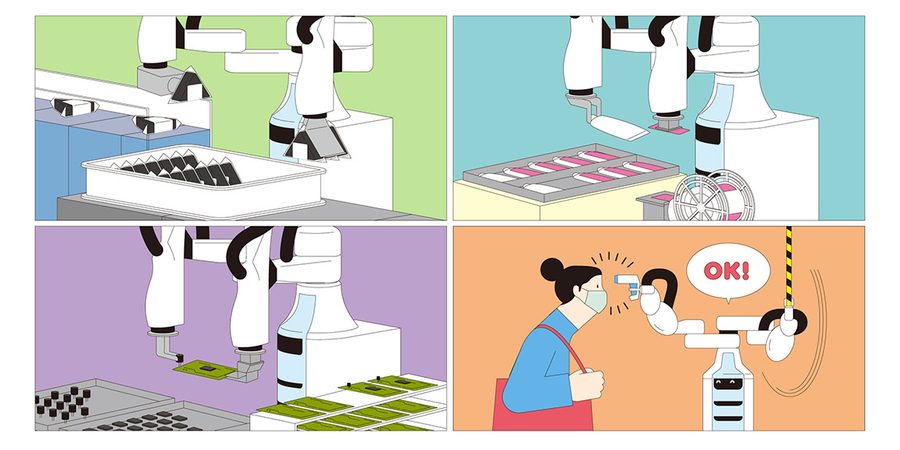 そしてコロナ禍の現在では、博物館への来館者に対して、片アームがゲートの役割をし、もう片アームでお客様の検温を自動で行うduAroも登場。このように時代の要請にフレキシブルに対応できるのが協働ロボットの魅力であり、可能性でもあるのです。