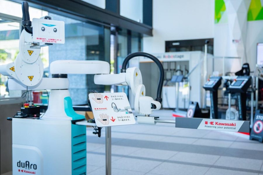 新型コロナ感染症拡大予防の観点から、現在多くの事業者や職場では、従業員や訪問者が敷地内へ入る前に検温を実施しています。非接触式体温計を入口で「おでこにピッ」とする光景はいまや日常になりました。そして、2020年夏に登場したのがこの「おでこにピッ」を人の代わりに行なうduAroです。すでに「神戸海洋博物館・カワサキワールド」(兵庫・神戸)や「Kawasaki Robostage」(東京・お台場)の受付に実装されています。