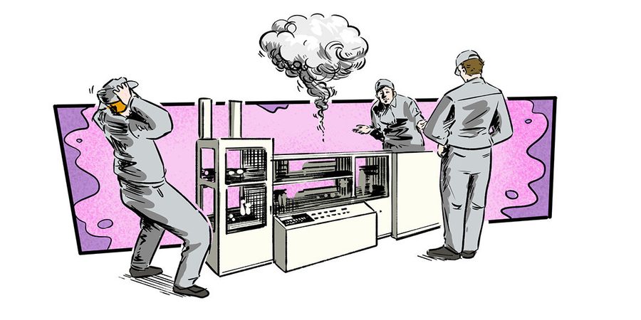 数名の従業員が古びた機械をぐるり取り囲んで、何事かを口論している。