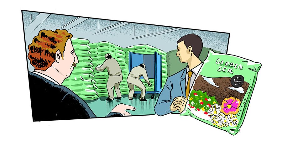 この会社で扱っている製品は、観葉植物や庭の土を覆うチップ材。ガーデニングの世界で「マルチング」と呼ばれる作業に用いるもので、土面を覆うことで雑草や乾燥を防止したり、土中を適温に保つのに役立つ。