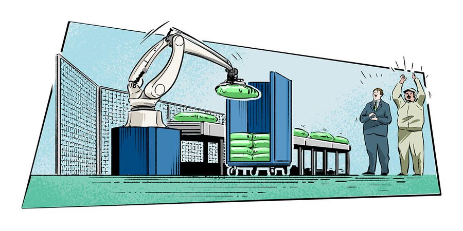 このストーリーは、川崎重工における事例に基づいたフィクションです。実際の現場では、「軽量で大型、かつ滑りやすいビニール袋を規定のパレットへ正確に荷積みする作業が困難」であり、かつ「大型ビニール袋を積み重ねるという肉体労働を長時間反復する」ことと「高所での作業」がもたらす従業員の健康面のリスク、さらに「過酷で単純な作業のため従業員が定着しない」という課題も抱えていました。それらを解決するために、川崎重工製の高速パレタイジングロボットと、米コロラド・デンバーのロボットシステムインテグレータ「Nova Automation」による自動パレタイジングスタックボックスを組み合わせ、荷積みプロセスを完全自動化。最大18時間/日、最大22袋/分、平均18袋/分の作業を可能にしました。毎分18袋の荷積みは、2人の労働者の仕事量に相当。現在自動化ラインは1日9時間で、繁忙期は最大18時間稼働していて、同社は他にある2つのラインでも自動化を検討中とのことです。