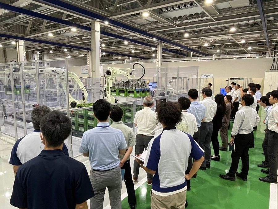 プレゼンでの説明後、内覧会の参加者の皆様には工場内にある国内最大規模のロボットショールームへ移動していただき、産業用ロボットの代表格である溶接ロボットや塗装ロボット、工程間搬送を実現する自走式ロボット“TRanbo”などをご覧いただきました。
