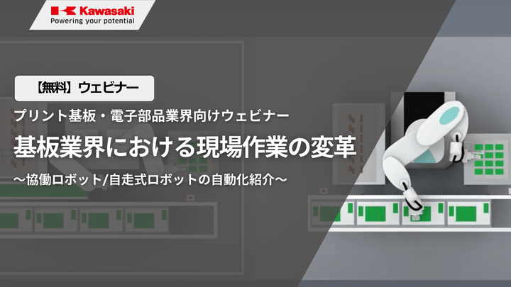 ウェビナーの概要 この度、プリント基板・電子部品業界向けウェビナーを開催いたします。本ウェビナーでは、川崎重工の双腕スカラ型の協働ロボット「duAro」や自走式ロボット「TRanbo-7」などのカワサキ独自のロボットを用 […]