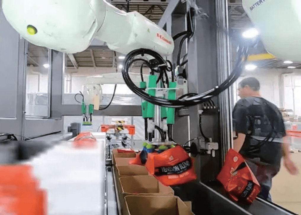 米国ミシガン州のカワサキ認定SIerであるMWES社は、食品・飲料業界における労働力不足と多品種・異なる箱サイズへの対応という課題を解決するため、川崎重工の小型汎用ロボットRS007Lにビジョンソフト「K-VFinder」を組み合わせ、コンベアトラッキングと真空グリッパーを活用した柔軟な箱詰め自動化セルを構築しました。このシステムは、ビジョン認識によって流れる袋製品を正確に追跡し、最適なピック位置をリアルタイムで決定することで、毎分80袋の高速処理と異なる箱サイズへの即時対応を実現し、最大3名の省人化と高い生産性を達成しました。